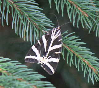And the colourful Jersey Tiger Moth, seen first on a conifer and then on the window....