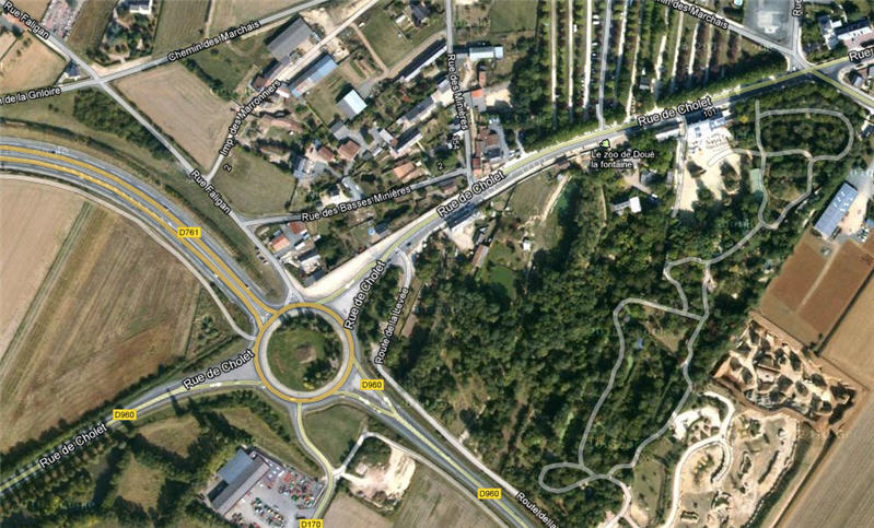 it reveals that the roundabout is right next to 'La Zoo de Doué-la-Fontaine.' which has a tower of Giraffes and some good revues from Tripadvisor.